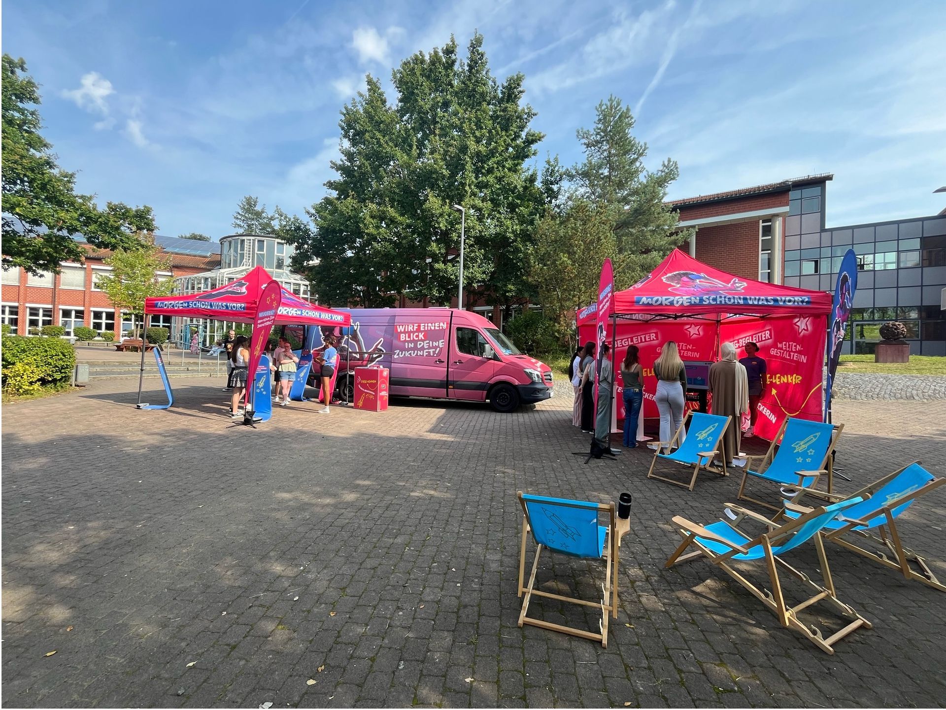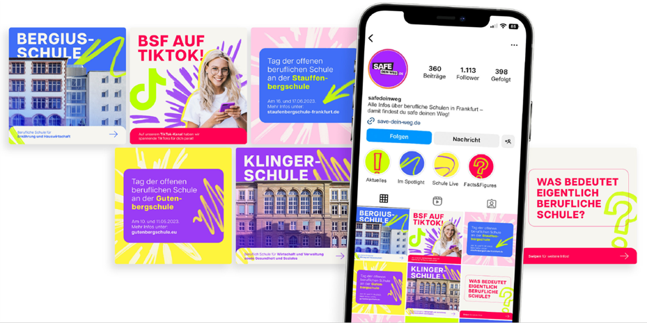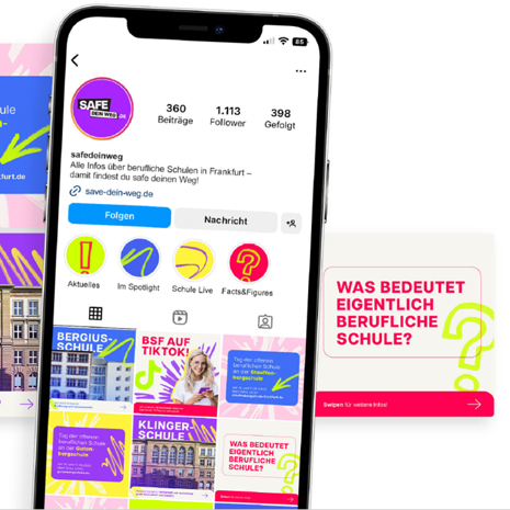 Instagram-Kanal, auf denen Schüler*innen der Beruflichen Schulen Frankfurt als Botschafter*innen unterwegs sind. Offline besticht die Kampagne durch ihren in auffälligen Farben gestalteten Messestand und auf die Zielgruppen angepasstes Infomaterial in Form von Postkarten und weiteren nützlichen Werbemitteln für die Schulzeit.
