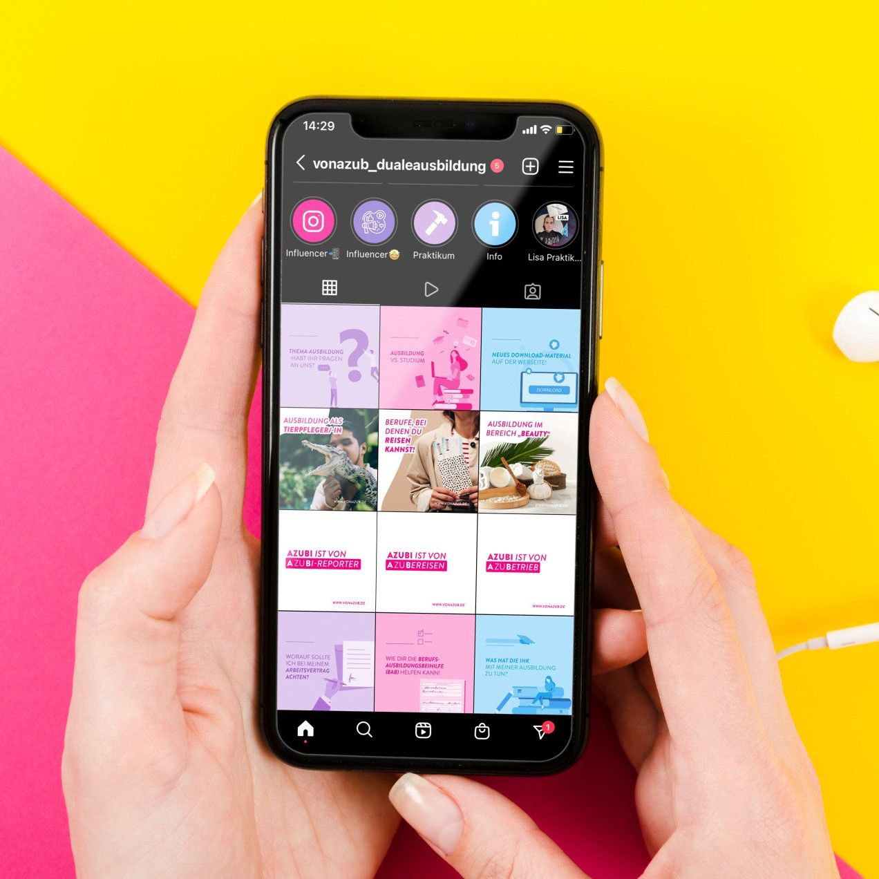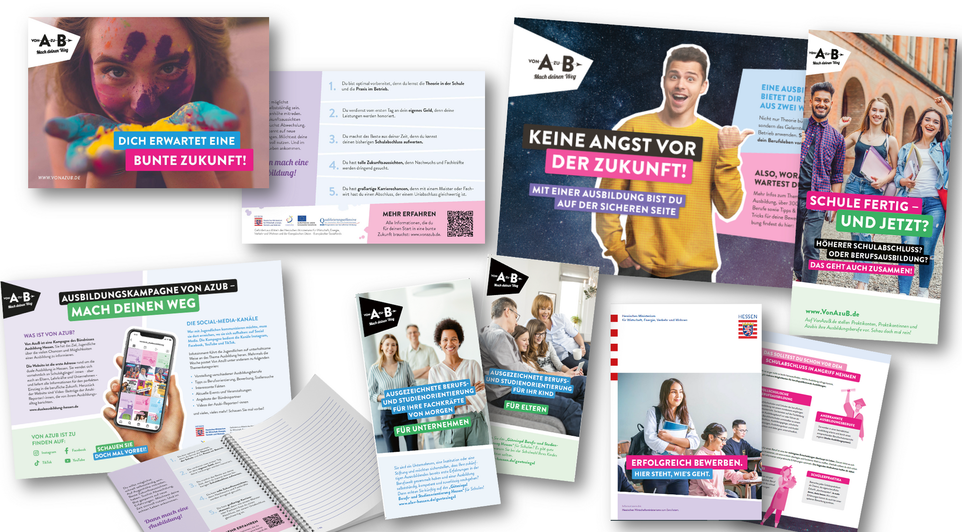 "Azubi ist von A zu B – Mach‘ deinen Weg" – so lautet der Slogan der hessischen Imagekampagne für das Hessische Ministerium für Wirtschaft, Energie, Verkehr und Wohnen, die für die duale Ausbildung in Hessen wirbt und die wir 2020 übernommen haben. Kernstück der Kampagne sind sogenannte "Azubi-Reporter*innen" aus verschiedenen hessischen Ausbildungsbetrieben, die auf Augenhöhe mit den Jugendlichen über sich und ihre Ausbildung berichten. Mit einem Smartphone ausgestattet, halten die Azubis ihre Erfahrungen auf Video fest und begeistern so andere für eine duale Ausbildung. Diese Videos posten wir nicht nur auf der von uns designten Kampagnenwebsite, sondern auch in den Sozialen Medien, wo die Jugendlichen heute hauptsächlich zu finden sind.