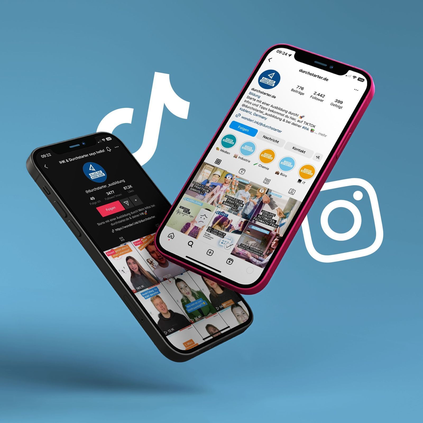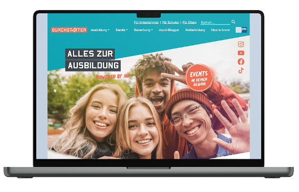 "Durchstarter" heißt die von uns designte und betreute Nachwuchskampagne der IHK-Arbeitsgemeinschaft Rheinland-Pfalz, die Jugendliche für eine duale Ausbildung in der Region begeistern und damit den Fachkräftenachwuchs in den Unternehmen sichern möchte. Der Website durchstarter.de, dem Herzstück der Kampagne, verpassten wir nicht nur zweimal ein Facelift, sondern überarbeiteten auch Struktur und Inhalte, damit die User*innen die für sie relevanten Informationen noch schneller finden. Auch die von uns gestaltete IHK-Broschüre "Schule und was dann“ liefert Antworten auf die Frage, was nach der Schule kommt. Abgerundet wird das Maßnahmenpaket durch die von uns betreuten Social-Media-Kanäle auf Instagram, Facebook und TikTok.